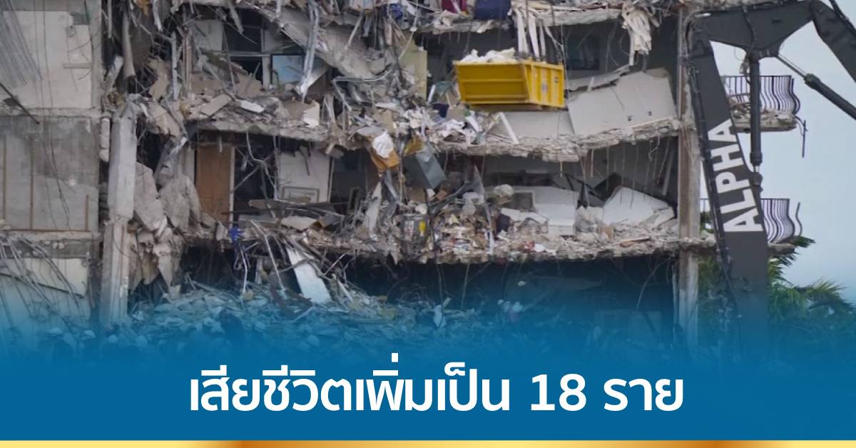 ความคืบหน้าเหตุการณ์อพาร์ทเมนต์พังถล่มในเมืองเซิร์ฟไซด์ รัฐฟลอริดาของสหรัฐฯ ล่าสุดเจ้าหน้าที่กู้ภัยสามารถนำร่างผู้เสียชีวิตออกมาจากกองซากอาคารได้อีก 6 ศพในช่วง 24 ชั่วโมงที่ผ่านมา ทำให้ยอดผู้เสียชีวิตเพิ่มเป็น 18 คนแล้ว และจนถึงขณะนี้ยังมีผู้สูญหายอีก 147 คน เจ้าหน้าที่กู้ภัยยังคงเดินหน้าค้นหาอย่างต่อเนื่อง พร้อมกับมีคำแนะนำว่าควรจะใช้เครื่องจักรกลหนักเข้ามาช่วยในการค้นหาเพราะจะทำให้ปฏิบัติงานได้เร็วขึ้น ขณะที่ญาติของผู้สูญหายมีการยื่นฟ้องศาลในรัฐฟลอริดา เพื่อเรียกร้องความเสียหายจากบริษัทคอนโดมิเนียมที่เป็นเจ้าของอาคารแชมเพลนทาวเวอร์ที่พังถล่มลงมา.-สำนักข่าวไทย