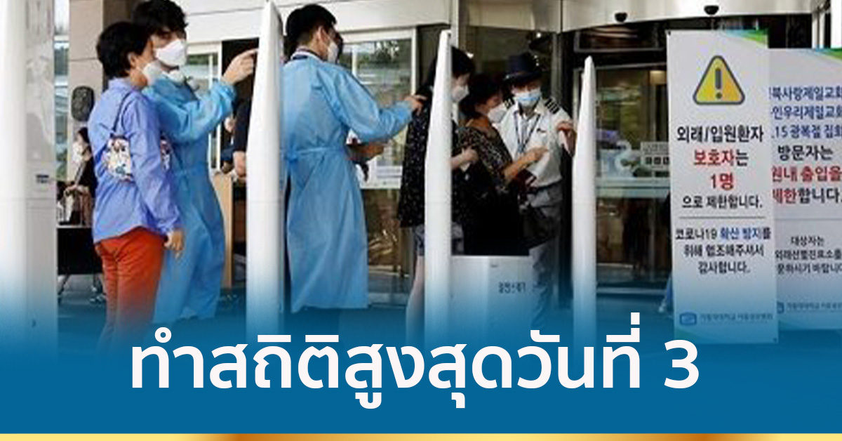 โซล 10 ก.ค. – สำนักงานควบคุมและป้องกันโรคเกาหลี หรือ เคดีซีเอ ของเกาหลีใต้รายงานวันนี้ว่า เกาหลีใต้พบผู้ติดเชื้อไวรัสโคโรนา 2019 รายวันทำสถิติสูงสุดอีกครั้งในรอบ 24 ชั่วโมงที่ผ่านมา และเป็นวันที่ 3 ติดต่อกันแล้วที่จำนวนผู้ติดเชื้อเพิ่มสูงเป็นสถิติใหม่