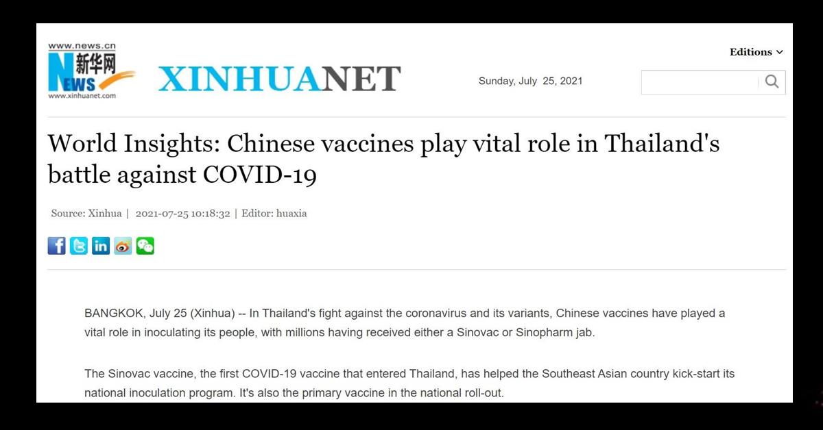 เว็บไซต์ซินหัวรายงานว่า ซิโนแวกเป็นวัคซีนต้านโควิดขนานแรกที่เข้ามาในไทย ช่วยให้ไทยเริ่มโครงการฉีดวัคซีนระดับชาติ และเป็นวัคซีนหลักในโครงการนี้ ข้อมูลของสถานทูตจีนในไทยเผยว่า จีนจัดส่งวัคซีนให้ไทยแล้ว 17 ลอต รวมทั้งหมด 17 ล้าน 5 แสนโดสจนถึงวันเสาร์ นอกจากนี้จีนยังจัดส่งกว่า 500 ล้านโดสให้แก่กว่า 100 ประเทศและองค์กรระหว่างประเทศ คิดเป็น 1 ใน 6 ของวัคซีนที่จัดสรรทั่วโลก ผลการศึกษาหลายชิ้นระบุว่า วัคซีนจีนมีประสิทธิภาพสูงในการป้องกันการติดเชื้อ การเข้าโรงพยาบาล การป่วยหนัก และการเสียชีวิตจากโรคโควิด-19 กระทรวงสาธารณสุขไทยได้ศึกษาภาคสนามกับกลุ่มเสี่ยงสูงที่ฉีดวัคซีนซิโนแวกใน 3 พื้นที่ที่มีการระบาดหนักที่สุดพบว่า วัคซีนซิโนแวก 2 เข็มช่วยป้องกันได้ดีต่อการติดเชื้อโรคโควิด-19 และอาการปอดอักเสบ ทั้งจากไวรัสสายพันธุ์อัลฟาหรือเดลตา