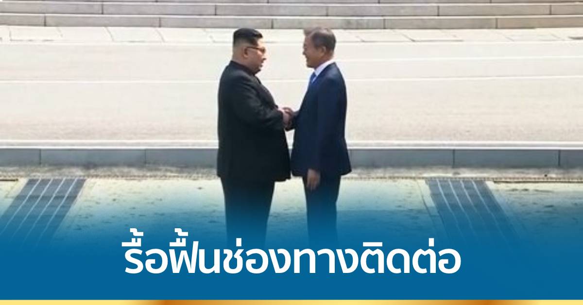 โฆษกประจำทำเนียบประธานาธิบดีเกาหลีใต้กล่าวว่า ประธานาธิบดีมุน แจ-อิน ของเกาหลีใต้และนายคิม จอง-อึน ผู้นำสูงสุดของเกาหลีเหนือ ได้แลกเปลี่ยนจดหมายติดต่อกันหลายฉบับตั้งแต่เมื่อเดือนเมษายนที่ผ่านมาและได้ตกลงร่วมกันที่จะให้กลับไปเชื่อมต่อโทรศัพท์สายตรงเพื่อติดต่อกันอีกครั้ง ในขณะที่สำนักข่าวกลางเกาหลี หรือ เคซีเอ็นเอ ของทางการเกาหลีเหนือ ก็กล่าวว่า ช่องทางการติดต่อระหว่างสองเกาหลีทุกช่องทางกลับมาดำเนินการอีกครั้งเมื่อเวลา 10.00 น. วันนี้ตามเวลาท้องถิ่น หรือ ตรงกับ 08.00 น. เช้าวันนี้ตามเวลาในประเทศไทย ซึ่งเป็นไปตามข้อตกลงระหว่างนายมุน และ นายคิม โฆษกประจำทำเนียบประธานาธิบดีเกาหลีใต้กล่าวว่า ผู้นำของสองประเทศร่วมกันสำรวจหนทางในการรื้อฟื้นความสัมพันธ์ด้วยการส่งจดหมายไป-มา ระหว่างกันในหลายโอกาส และตกลงที่จะต่อสายโทรศัพท์สายตรงที่ถูกตัดไปก่อนหน้านี้ ซึ่งจะเป็นก้าวแรกของกระบวนการรื้อฟื้นความสัมพันธ์ ทั้งสองฝ่ายยังตงลงที่จะกลับไปไว้วางใจต่อกันอีกครั้งโดยเร็วที่สุดเท่าที่จะเป็นไปได้และส่งเสริมการพัฒนาความสัมพันธ์ให้ก้าวหน้าต่อไปอีกครั้ง