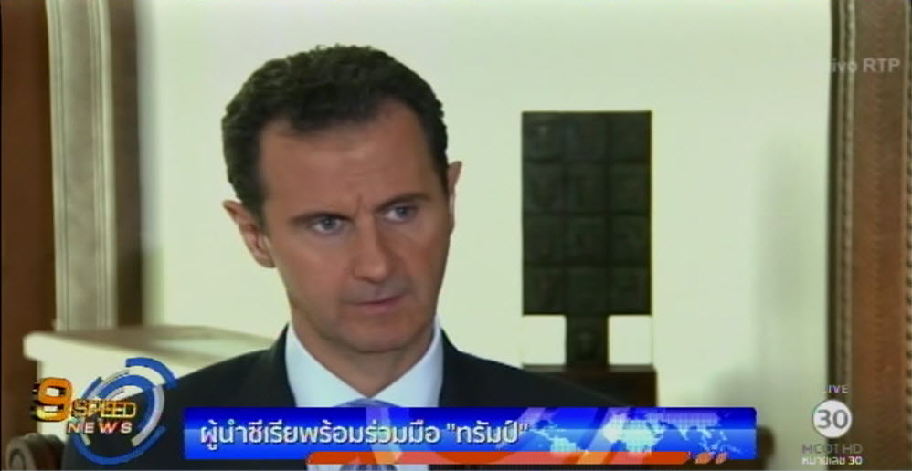 ประธานาธิบดีบาชาร์ อัล อัสซาด ของซีเรีย ให้สัมภาษณ์รายการโทรทัศน์ระบุว่า นายโดนัลด์ ทรัมป์ ว่าที่ประธานาธิบดีสหรัฐ อาจจะเป็นพันธมิตรที่เป็นปกติ สำหรับรัฐบาลซีเรียในสงครามกลางเมืองที่ยังร้อนระอุ ซึ่งจากนี้ไปจะจับตามองรัฐบาลใหม่ของสหรัฐ ว่าจะทำตามที่นายทรัมป์เคยประกาศไว้หรือไม่ โดยเฉพาะการปราบปรามกลุ่มไอเอส เพราะซีเรียได้รับผลกระทบหนักกว่าประเทศใดๆ ในโลก