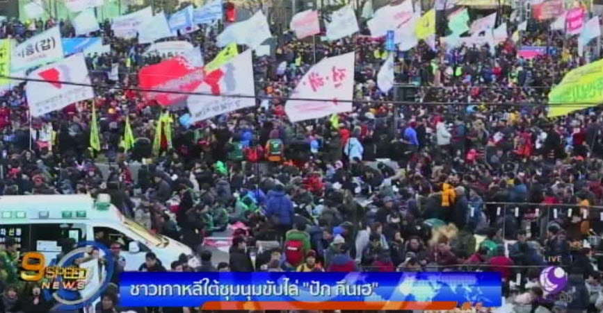 เกาหลีใต้ 26 ก.พ. – เมื่อวานนี้ชาวเกาหลีใต้หลายแสนคนพากันไปรวมตัวที่กลางกรุงโซลเพื่อเรียกร้องให้ประธานาธิบดีปัก กินเฮ ลาออกจากตำแหน่งโดยทันที ผู้ประท้วงคนหนึ่ง กล่าวว่า ที่มีคนออกมาชุมนุมขับไล่นางปัก เนื่องจากเป็นวันครบรอบปีที่ 4 ของการเข้ารับตำแหน่งประธานาธิบดีเกาหลีใต้ของเธอ ซึ่งสมควรถูกถอดถอนออกจากตำแหน่งได้แล้ว ขณะที่อีกคนกล่าวว่า หากศาลพิพากษาให้นางปัก ไม่ถูกพิจารณาถอดถอนออกจากตำแหน่งเชื่อว่าจะมีคนมาร่วมชุมนุมากขึ้น สำหรับนางปัก ถูกกล่าวหาว่า ยอมให้เพื่อนสนิทใช้ตำแหน่งประธานาธิบดีของเธอแสวงหาผลประโยชน์เป็นเงินหลายสิบล้านดอลลาร์จากบริษัทยักษ์ใหญ่ในเกาหลีใต้. -สำนักข่าวไทย