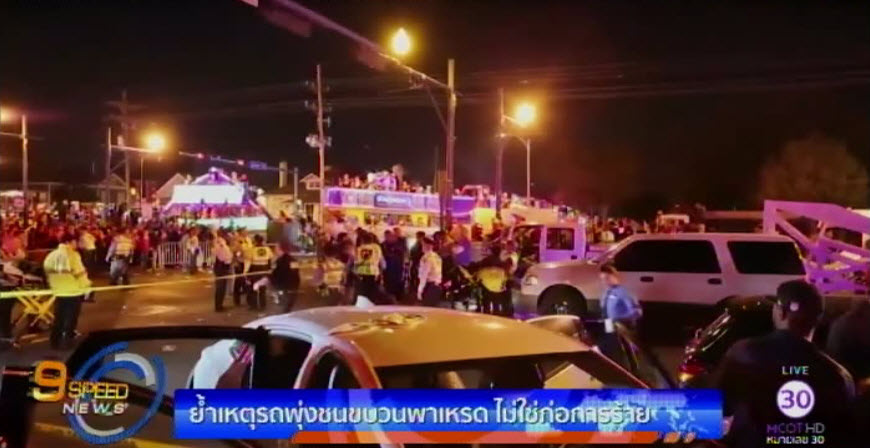 สหรัฐ 26 ก.พ. – เจ้าหน้าที่ระบุว่าเหตุชายคนหนึ่งขับรถบรรทุกเสียหลักพุ่งชนกลุ่มคนที่กำลังดูขบวนพาเหรด กลางเมืองนิวออร์ลีน รัฐหลุยเซียน่าของสหรัฐเมื่อวาน ทำให้มีผู้ได้รับบาดเจ็บ 12 คน สามารถควบคุมตัวผู้ต้องสงสัยได้ 1 คน และไม่ใช่ก่อการร้าย ส่วนคนเจ็บทั้ง 12 คน แอเบรีย วอชิงตัน โฆษกตำรวจเผยว่าอาการสาหัส คาดว่าอาจจะมีคนเจ็บเพิ่มขึ้นอีก ผู้เห็นเหตุการณ์คนหนึ่งเล่าว่า รถบรรทุกคันดังกล่าวแล่นเฉียดเธอไปนิดเดียว ขณะที่อีกคนบอกว่า เหมือนชายคนขับรถพุ่งเข้าใส่ฝูงชนโดยไม่รู้ตัวด้วยซ้ำว่าเกิดเหตุอะไรขึ้น. -สำนักข่าวไทย