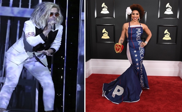 ภาพรัฐธรรมนูญสหรัฐขนาดใหญ่ที่ฉายบนเวทีการประกาศรางวัล หรือเคที เพอร์รี นักร้องเพลงป็อบที่สวมปลอกแขนมีคำว่า PERSIST แปลว่า ดื้อแพ่ง ขึ้นเวทีร้องเพลง สะท้อนถึงกระแสการแสดงออกทางการเมืองของบรรดาศิลปินในงานประกาศผลรางวัลที่เริ่มมาตั้งแต่เวทีลูกโลกทองคำครั้งที่ 74 เมื่อต้นเดือนมกราคม ครั้งนั้นเมอรีล สตรีฟ นักแสดงหญิงอาวุโสตำหนิประธานาธิบดีโดนัลด์ ทรัมป์ขณะเธอกล่าวรับรางวัลเกียรติยศเซซิล บี เดอ มีลล์ ขณะที่เจมส์ คอร์เดน นักแสดงตลกและพิธีกรรายการโทรทัศน์ที่รับหน้าที่พิธีกรเวทีแกรมมีเป็นครั้งแรกได้แร็พสียดสีประธานาธิบดีทรัมป์ ส่วน Chance the Rapper นักร้องเพลงแร็พวัย 23 ปี เจ้าของรางวัลศิลปินหน้าใหม่ยอดเยี่ยมประจำปีนี้ มาร่วมงานด้วยชุดเสื้อคลุมสีดำด้านหลังมีคำว่า OBAMA44 ด้านหน้ามีคำว่า THANK YOU