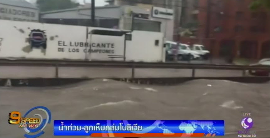 โบลิเวีย 12 ก.พ.- สถานการณ์น้ำท่วมอย่างรุนแรงและพายุลูกเห็บพัดถล่มในเมืองซานตาครูซ และเมืองซูเคร ทางภาคกลางของโบลิเวีย ทำให้มีผู้เสียชีวิตแล้วอย่างน้อย 2 คน ทางการต้องแจ้งเตือนภัยในระดับสีเหลือง ที่ เมืองซูเคร มีลูกเห็บขนาดใหญ่ตกอยู่นานราวครึ่งชั่วโมง ทำให้ถนนสายต่างๆ ไม่สามารถใช้สัญจรได้ พายุลูกเห็บครั้งนี้เกิดขึ้นหลังจากในช่วงหลายเดือนก่อนหน้านี้โบลิเวีย ต้องเผชิญกับความแห้งแล้งรุนแรงที่สุดในรอบ 25 ปี และคาดว่า ในวันอาทิตย์นี้จะมีพายุฝนฟ้าคะนองเกิดขึ้นอีก. -สำนักข่าวไทย