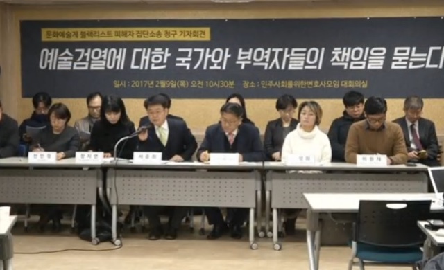 กลุ่มทนายความเพื่อสังคมประชาธิปไตยเป็นตัวแทนศิลปินยื่นฟ้องประธานาธิบดี อดีตหัวหน้าคณะเจ้าหน้าที่ทำเนียบ อดีตรัฐมนตรีวัฒนธรรมและหน่วยงานด้านวัฒนธรรมว่า ละเมิดสิทธิที่จะพูดและแสดงความเห็นอย่างเสรีและสิทธิเรื่องความเป็นส่วนของศิลปิน กรณีรวบรวมข้อมูลส่วนตัวของพวกเขาไปขึ้นบัญชีดำรายชื่อศิลปินที่จะไม่ได้รับการสนับสนุนจากรัฐบาล การขึ้นบัญชีดำดังกล่าวเป็นการย้อนกลับไปสู่ยุคเผด็จการของนายพลปัก จุงฮี อดีตประธานาธิบดีที่เป็นบิดาของนางปัก ข้าราชการและผู้รู้เห็นกับการกระทำดังกล่าวจะต้องถูกลงโทษ