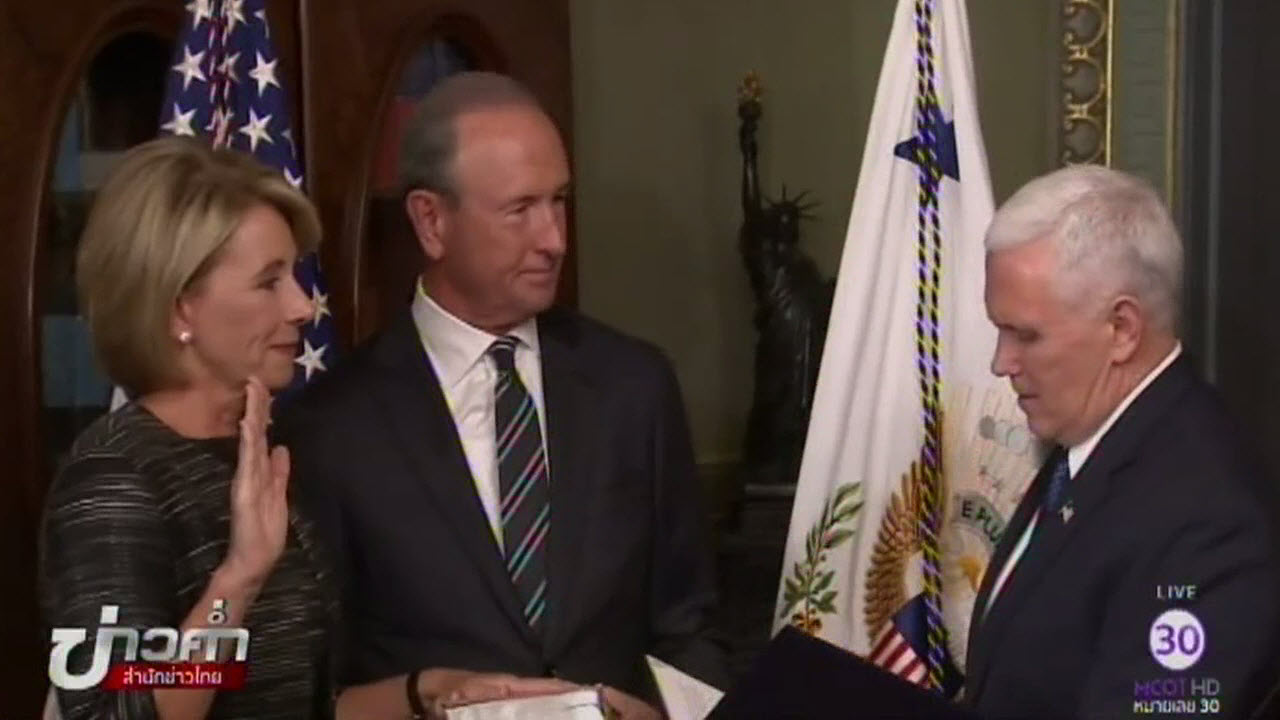 โดยตำแหน่งต้องโหวตตัดสินชี้ขาด ทำให้นางเดอวอสผ่านความเห็นชอบไปได้ด้วยคะแนนเฉียดฉิว โดย สว.หลายคนลงความเห็นว่านางเดอวอส ไม่มีความรู้เรื่องระบบการศึกษาเลย โดยเธอไม่สามารถตอบคำถามพื้นๆเกี่ยวกับระบบการศึกษาของสหรัฐได้เลย แต่นางเดอวอสชอบบริจาคเงิน ช่วยพรรครีพับลิกัน หลายคนจึงมองว่าเธอใช้เงินซื้อตำแหน่งนี้จากนายทรัมป์ โดยกระแสคัดค้านนางเดอวอสมีมากมายจากทั่วประเทศเพราะเธอไม่สนับสนุนการศึกษาของรัฐบาล แต่สนับสนุนการศึกษาภาคเอกชน แถมยังชอบเสนอนโยบายแผลงๆ เช่นเสนอให้โรงเรียน ในรัฐไวโอมิงอนุญาตให้ครูและนักเรียนพกปืนมาโรงเรียนได้ เพื่อป้องกันตัวจากการถูกหมีกริซลีทำร้าย.-สำนักข่าวไทย
