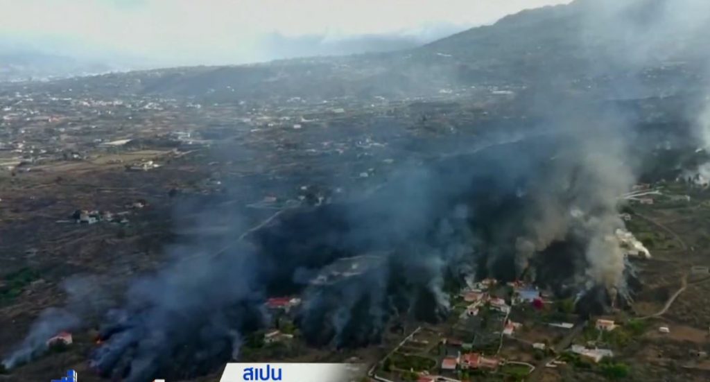 สเปน 23 ก.ย. – ภาพมุมสูงจากโดรน เผยให้เห็นธารลาวาสีแดงไหลลงมาจากภูเขาไฟบนเกาะลาปัลมา ประเทศสเปน ทำลายอาคารบ้านเรือนและทุกสิ่งอย่างตามเส้นทางผ่าน