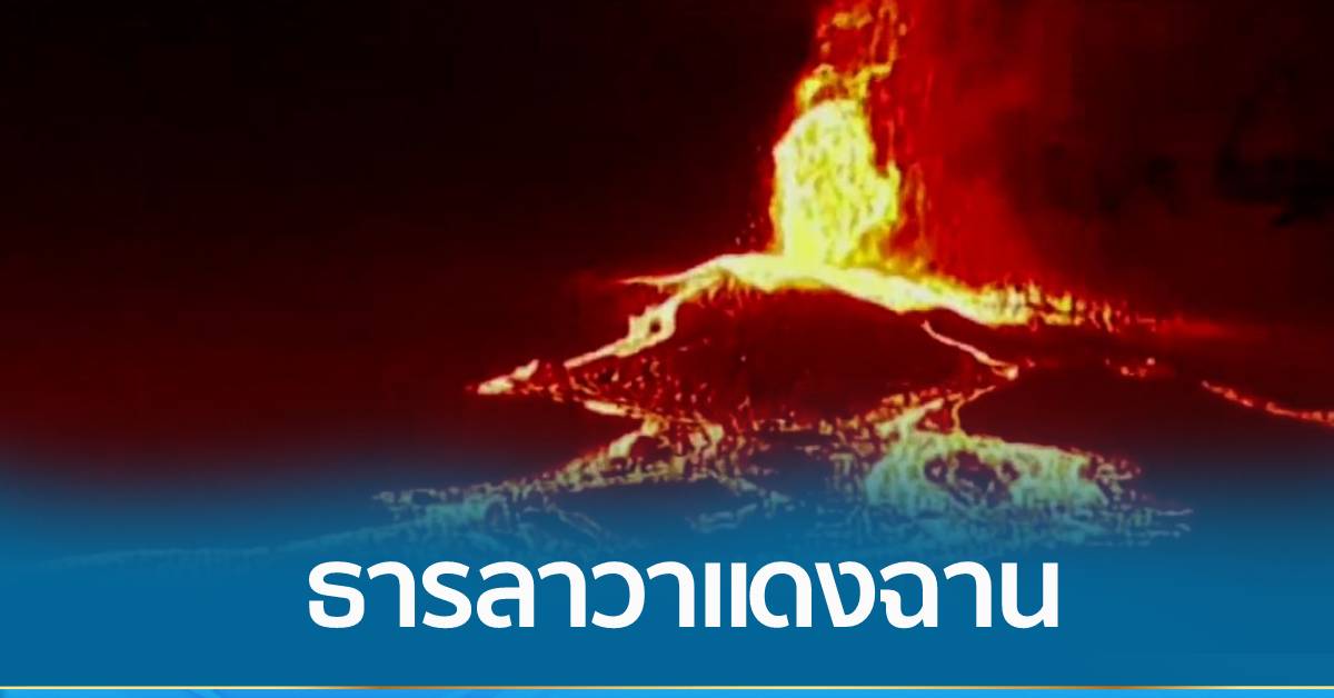 ภาพถ่ายมุมสูงที่เผยให้เห็นธารลาวาสีแดงฉาน ไหลจากภูเขาไฟกุมแบร วิเอคา บนเกาะลาปัลมา ทำลายอาคารบ้านเรือนและพื้นที่การเกษตร และทุกสิ่งทุกอย่างตามเส้นทางที่ไหลผ่าน ขณะที่กระแสแม็กมา ระเบิดพวยพุ่งขึ้นสู่อากาศเมื่อคืนที่ผ่านมา ฉาบทาท้องฟ้าในเวลากลางคืนให้กลายเป็นสีแดง พ่นเปลวไฟออกด้านข้างของปากปล่องภูเขาไฟ