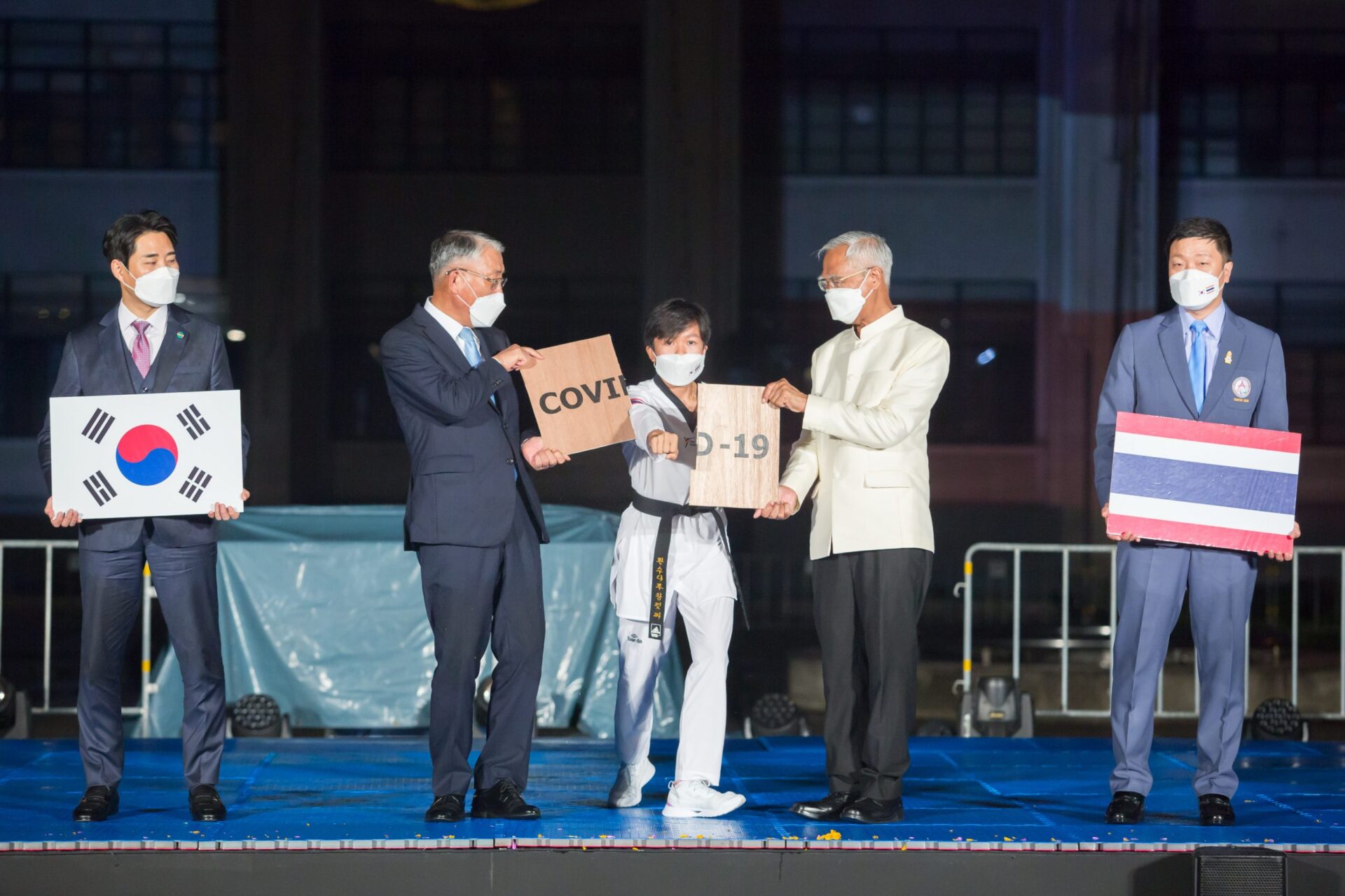 ในช่วงท้ายของงาน โค้ชเช หรือ ชเว ยอง ซอก โค้ชเทควันโดทีมชาติ และ ชิน ยอง กุน โค้ชเทควันโดคนพิการทีมชาติ ขึ้นเวที พร้อมกับขวัญสุดา พวงกิจจา นักกีฬาเหรียญทองแดงพาราลิมปิกเกมส์ โตเกียว โชว์ชกกระดานไม้ที่ชื่อว่า ‘โควิด-19’ จากนั้นผู้เข้าร่วมทุกคนทำกิจกรรมภาษามือเพื่อความหวังในการเอาชนะโควิด-19 ไปด้วยกัน.-สำนักข่าวไทย
