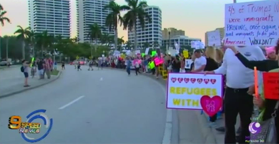 สหรัฐ 5 ก.พ. – กลุ่มผู้ประท้วงต่อต้านคำสั่งห้ามพลเมืองจาก 7 ประเทศมุสลิม เข้าสหรัฐของโดนัลด์ ทรัมป์ ประธานาธิบดีสหรัฐ ที่เมืองพาล์มบีช รัฐฟลอริดา ราว 1,000 คน มารวมตัวที่หน้าคอนโดมีเนียม มาร์ อา ลาโก ของนายทรัมป์ ผู้ประท้วงคนหนึ่ง กล่าวว่า หากนายทรัมป์ต้องการเป็นผู้นำที่ยิ่งใหญ่ ก็ไม่ควรออกนโยบายดังกล่าว เพราะผู้นำที่ยิ่งใหญ่จะต้องทำให้ประชาชนเข้าใจในสิ่งที่ตนทำ สำหรับสถานที่แห่งนี้เป็นที่นายทรัมป์ เข้าร่วมงานที่จัดขึ้นโดยกาชาดสากล ด้านนายทรัมป์ได้กล่าวว่า กระทรวงยุติธรรมจะต้องชนะอุทธรณ์คำสั่งห้ามพลเมืองจาก 7 ชาติมุสลิมเข้าสหรัฐอย่างแน่นอน. -สำนักข่าวไทย