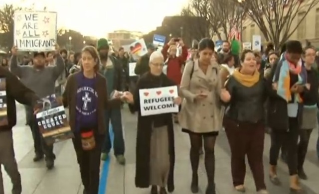 กลุ่มผู้ประท้วงรวมตัวชุมนุมบริเวณภายนอกของทำเนียบรัฐบาลในกรุงวอชิงตัน ดี.ซี. และประณามนโยบายสกัดผู้ลี้ภัยของรัฐบาลประธานาธิบดีโดนัลด์ ทรัมป์ คำสั่งพิเศษที่คาดว่านายทรัมป์จะลงนามในอีกไม่กี่วันข้างหน้าจะเป็นมาตรการสกัดผู้ลี้ภัยจากซีเรีย รวมถึงประเทศมุสลิมในแถบตะวันออกกลางและแอฟริกา อาทิ ซีเรีย ซูดาน โซมาเลีย อิรัก อิหร่าน ลิเบีย และเยเมน ขณะที่ผู้เชี่ยวชาญชี้ว่า นายทรัมป์จะสั่งห้ามไม่ให้ผู้ลี้ภัยเดินทางเข้าสหรัฐเป็นเวลาหลายเดือนจนกว่าจะมีกระบวนการตรวจสอบประวัติที่มีประสิทธิภาพมากกว่าเดิม ทั้งนี้ บรรดาชนกลุ่มน้อยทางศาสนาที่โดนกดขี่ข่มเหงจะได้รับการยกเว้น นโยบายสกัดคนเข้าเมืองของนายทรัมป์มีเป้าหมายที่จะป้องกันชาวมุสลิมเข้ามาก่อเหตุความรุนแรงในสหรัฐ แต่บรรดานักวิจารณ์กล่าวว่า มาตรการดังกล่าวจะทำให้สหรัฐตกเป็นเป้าของผู้อพยพทุกกลุ่ม