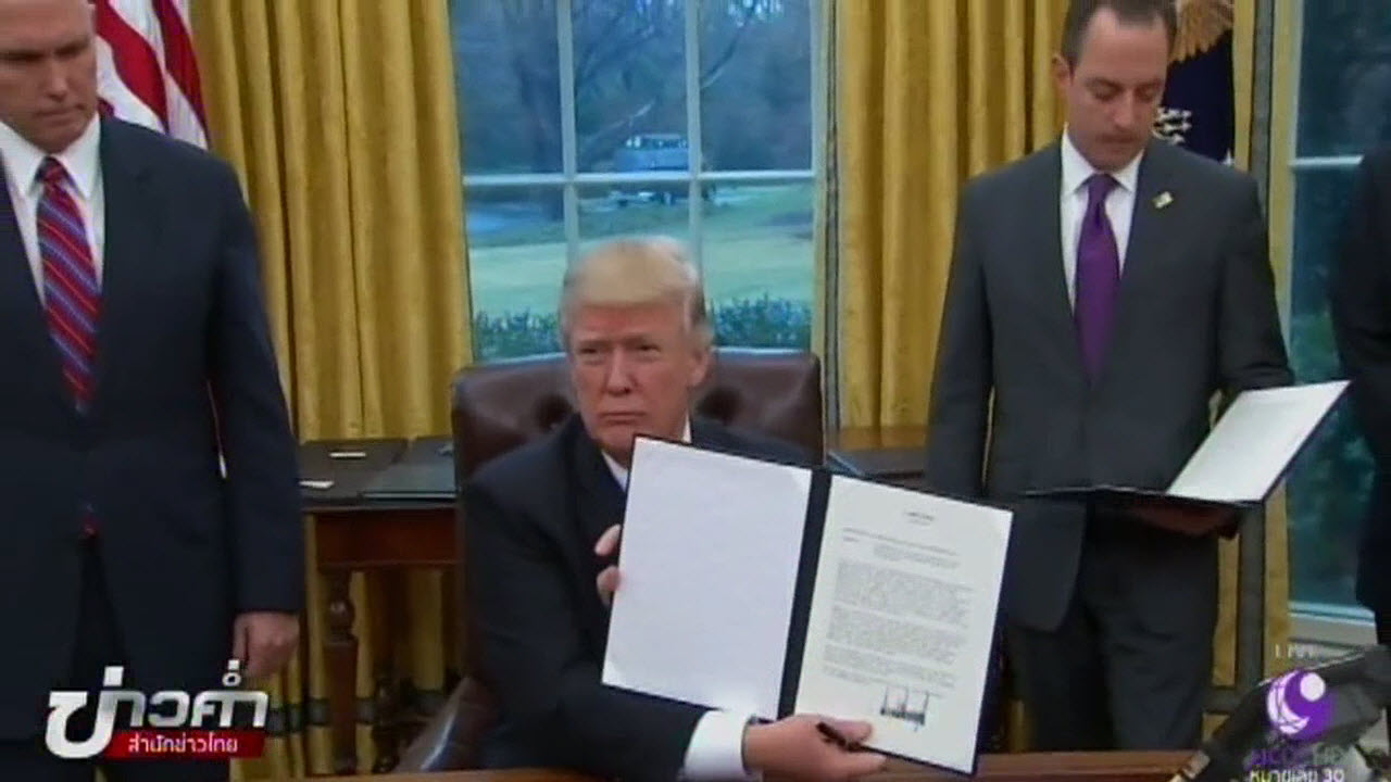 สหรัฐ 24 ม.ค.-ภูมิภาคเอเชีย-แปซิฟิก ต้องสั่นสะเทือนหลังประธานาธิบดี โดนัลด์ ทรัมป์ แห่งสหรัฐ ใช้อำนาจประธานาธิบดีลงนามในคำสั่งนำพาสหรัฐ ถอนตัวออกจากข้อตกลงความเป็นหุ้นส่วนยุทธศาสตร์ทางเศรษฐกิจในภูมิภาคแปซิฟิก หรือ TPP ที่อดีตประธานาธิบดี โอบามา ริเริ่มไว้เพราะว่ามองว่า จะทำให้สหรัฐเสียเปรียบ ขณะที่ชาติสมาชิก TPP ที่เหลืออีก 11 ชาติ เริ่มเคลื่อนไหวหาทางประคับประคองให้ข้อตกลง TPP ซึ่งครอบคลุม การค้าโลกถึง 40 เปอร์เซ็นต์ สามารถเดินหน้าต่อไปได้