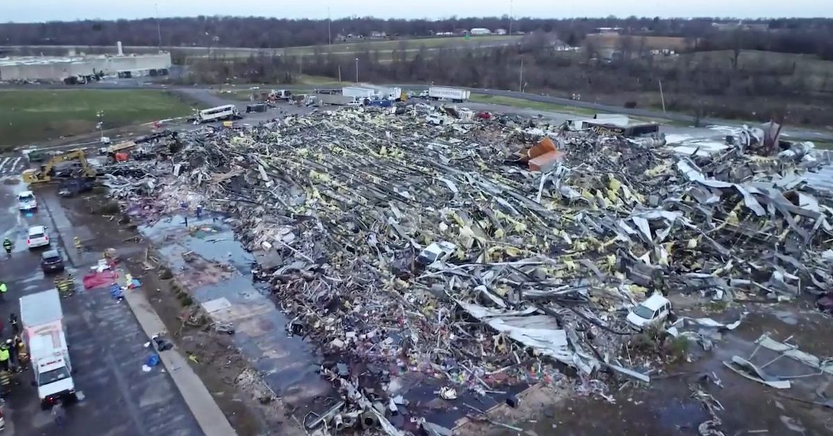 เมย์ฟิลด์ 12 ธ.ค. – พายุทอร์นาโด พัดกระหน่ำพื้นที่เป็นระยะทางกว่า 320 กิโลเมตรผ่านแถบมิดเวสต์และทางใต้ของสหรัฐ ทำลายบ้านเรือนประชาชน ห้างร้านธุรกิจต่าง ๆ เจ้าหน้าที่เร่งค้นหาผู้รอดชีวิตที่ติดอยู่ภายใต้ซากปรักหักพัง คาดมีผู้เสียชีวิตอย่างน้อย 100 คน ในรัฐเคนทักกี