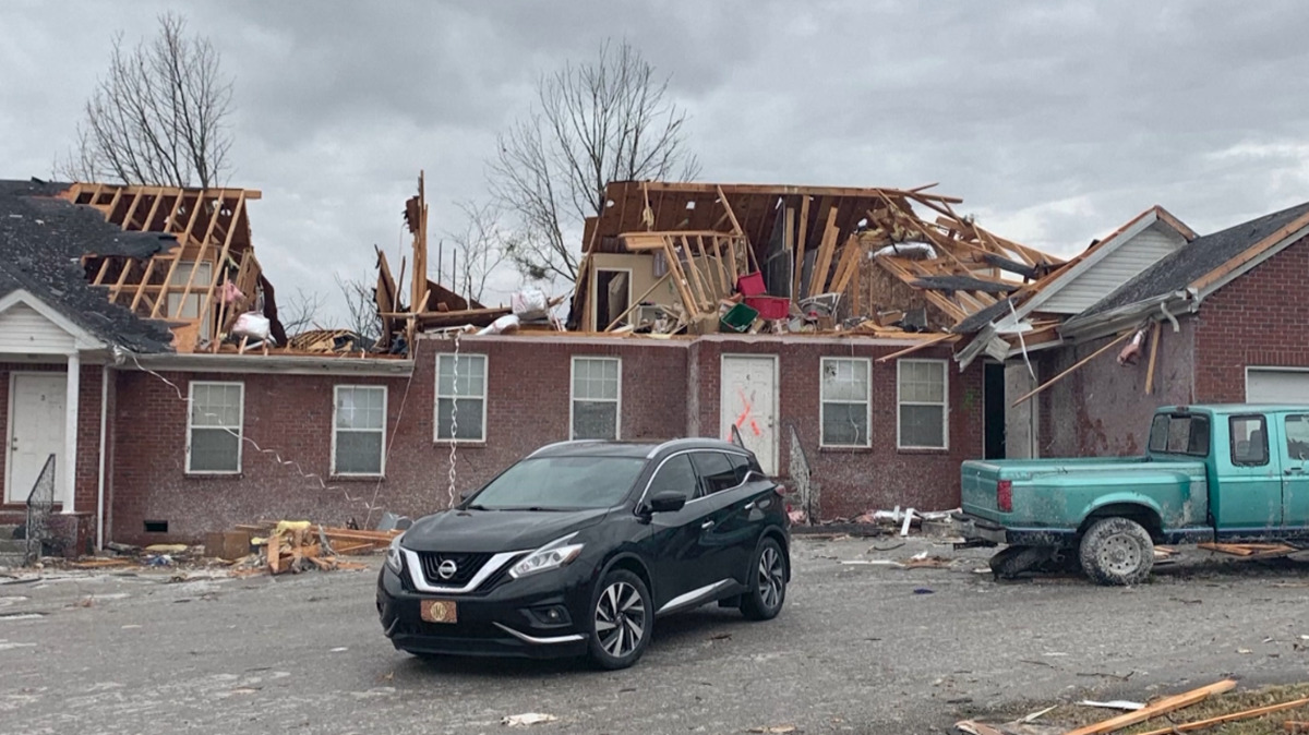 สำหรับพื้นที่ถูกทอร์นาโดพัดถล่ม อาคารสถานที่หลายแห่งพังราบเป็นหน้ากลอง หน่วยงานของรัฐ ทั้งตำรวจและหน่วยดับเพลิง ถูกทอร์นาโดพัดถล่มพังเสียหายเช่นกัน และยังเกิดไฟฟ้าดับเป็นบริเวณกว้าง เป็นอุปสรรคใหญ่ต่อปฏิบัติการช่วยเหลือและกู้ภัย. – สำนักข่าวไทย