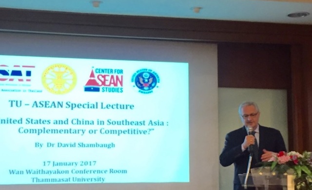 ดร.เดวิด แชมบอร์จ นักวิชาการชื่อดัง ด้านความสัมพันธ์ระหว่างประเทศ จากมหาวิทยาลัยจอร์จวอชิงตัน สหรัฐอเมริกา กล่าวในระหว่างการบรรยายพิเศษ หัวข้อ “สหรัฐและจีนในภูมิภาคเอเชียตะวันออกเฉียงใต้” ที่มหาวิทยาลัยธรรมศาสตร์ ท่าพระจันทร์ ว่า การเผชิญหน้าระหว่างสหรัฐและจีน จะทวีความเข้มข้นมากขึ้น หลังจากนายโดนัลด์ ทรัมป์ ก้าวขึ้นสู่ตำแหน่งประธานาธิบดีสหรัฐ ในอีกไม่กี่วันข้างหน้า และจะส่งผลให้ประเทศในกลุ่มประชาคมอาเซียน ได้รับผลกระทบทางอ้อมในหลายมิติ ทั้งเรื่องการเพิ่มกำลังทหาร พื้นที่พิพาท และประเด็นการค้าเสรี