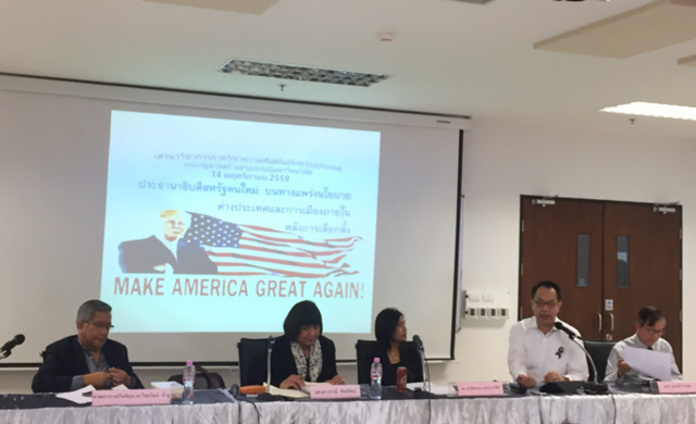 ศาสตราจารย์ ดร.สุรชาติ บำรุงสุข ซึ่ง เป็น1 ใน 4 นักวิชาการแห่งคณะรัฐศาสตร์ จุฬาฯ ที่ร่วมเสวนาในวันนี้กล่าวว่า อนาคตของสหรัฐภายใต้การบริหารของ นายโดนัลด์ ทรัมป์ ว่าที่ประธานาธิบดีสหรัฐคนที่ 45 จะเป็นไปในแนวอนุรักษ์นิยม และมีแนวโน้มที่จะปฏิเสธการค้าเสรี ไม่สนับสนุนการรวมกลุ่มระหว่างประเทศเหมือนสมัยประธานาธิบดีโอบามา อันเป็นผลมาจากเสียงของประชาชน ที่เบื่อหน่ายนโยบายแนวเสรีนิยมของประธานาธิบดีบารัค โอบามา ซึ่งผู้มีสิทธิ์เลือกตั้งมองว่า นโยบายของประธานาธิบดีโอบามา ทำให้คนตกงาน เศรษฐกิจถดถอย นอกจากนี้ ศาสตราจารย์ ดร.สุรชาติ ยังมองว่าผลการเลือกตั้งครั้งนี้ จะส่งผลกระทบให้ประชาคมโลกโดยรวมต้องเกิดการเปลี่ยนแปลง เพราะแต่ละประเทศ อาจหันมาดำเนินนโยบายอนุรักษ์นิยมเช่นเดียวกัน นอกจากนี้การเปลี่ยนแปลงนโยบายทางการทหาร อาจทำให้สหรัฐเสียดุลอำนาจทั้งทางเศรษฐกิจและความมั่นคงในหลายภูมิภาค