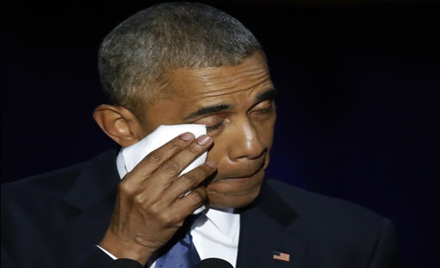 ชิคาโก 11 ม.ค.- ประธานาธิบดีบารัค โอบามาของสหรัฐปาดน้ำตาขณะกล่าวขอบคุณมิเชล โอบามา ผู้เป็นภรรยาและบุตรสาวทั้งสองคนระหว่างการกล่าวสุนทรพจน์อำลาตำแหน่ง