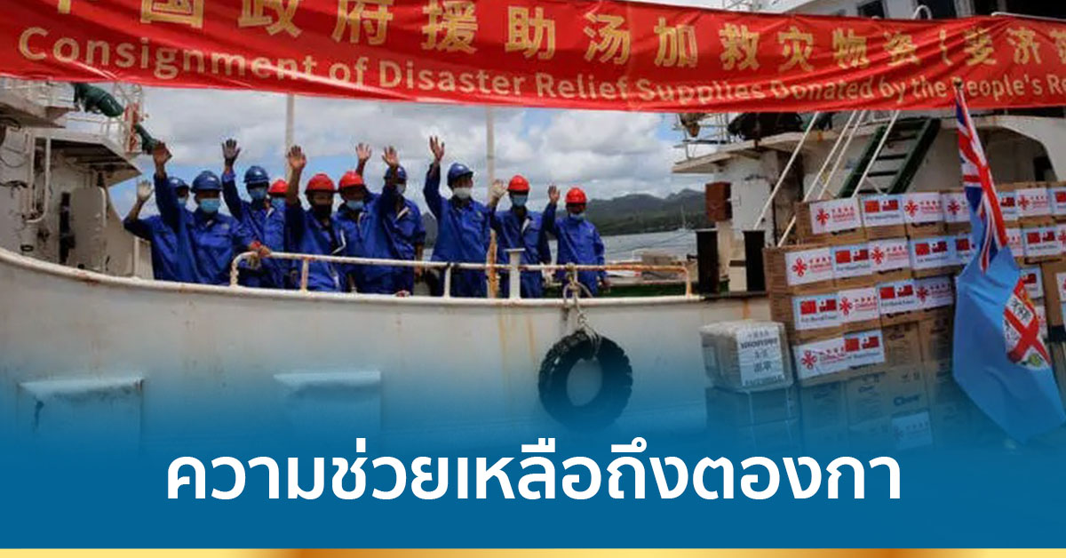 โฆษกกระทรวงต่างประเทศจีนแถลงวานนี้ว่า เรือของกองทัพเรือจีนบรรทุกอาหารและน้ำดื่มจะเดินทางจากฟิจิไปถึงตองกาในวันนี้ ขณะที่เครื่องบินทหาร 2 ลำจะลำเลียงสิ่งของบรรเทาทุกข์ฉุกเฉินจำนวน 33 ตัน เช่น น้ำดื่ม อาหาร เต็นท์ วิทยุสื่อสาร นอกจากนี้กองทัพเรือยังจะนำอุปกรณ์ขนาดใหญ่ เช่น รถไถ ปั๊มน้ำ เครื่องกำเนิดไฟฟ้าไปให้ในอีกหลายวัน ด้านโฆษกรัฐบาลจีนแถลงในวันเดียวกันว่า จีนจะเดินหน้าให้ความช่วยเหลืออย่างเต็มความสามารถเพื่ออำนวยความสะดวกให้แก่การบรรเทาทุกข์และบูรณะฟื้นฟูตามที่ทางการตองกาต้องการ รอยเตอร์รายงานว่า จีนอ้างว่าเป็นประเทศแรกที่นำอาหารและน้ำดื่มไปให้ตองกาเมื่อวันที่ 19 มกราคม แต่ไม่มีหลักฐานยืนยันในเรื่องนี้