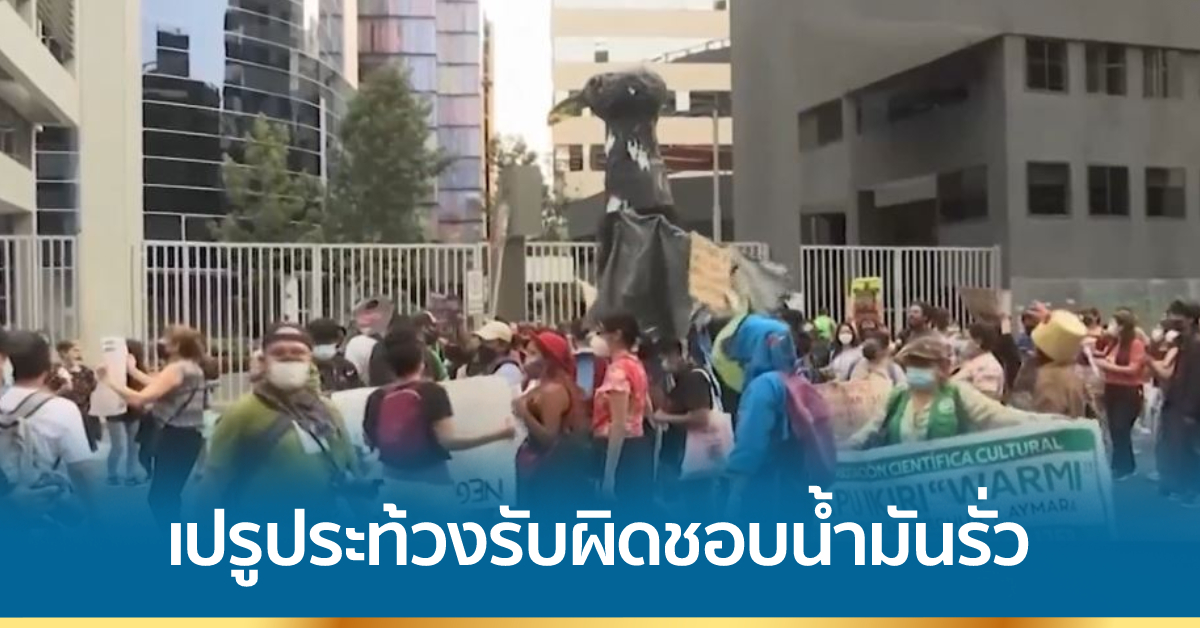 เปรู 27 ม.ค. – กลุ่มผู้ประท้วงรวมตัวกันหน้าสำนักงานเร็ปโซล และสถานทูตสเปน เพื่อต่อต้านกรณีน้ำมันดิบ 6,000 บาร์เรล รั่วไหลลงบนชายฝั่งเปรู