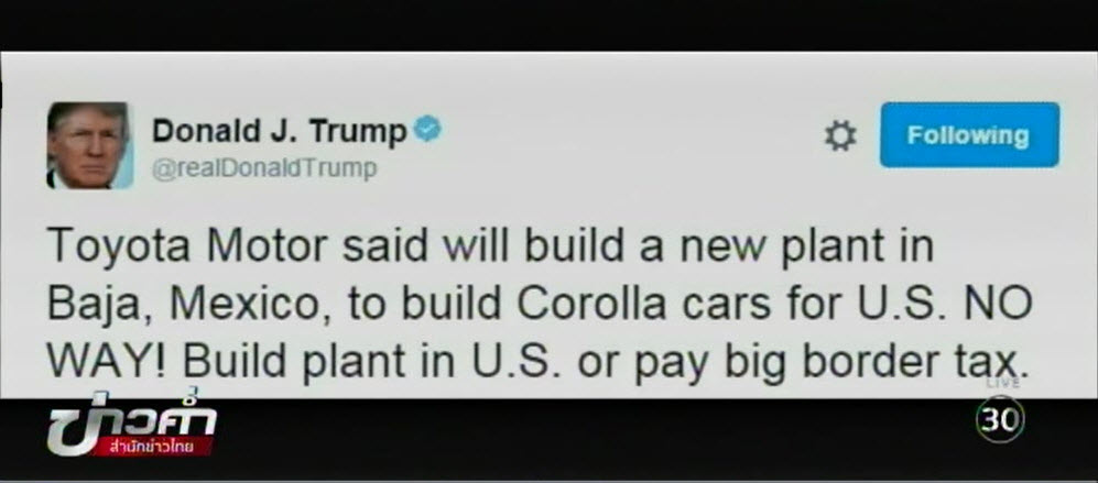 ทรัมป์ ทวีตข้อความ ระบุว่า โตโยต้า เตรียมสร้างโรงงานผลิตแห่งใหม่ ที่รัฐ บาฮา ในเม็กซิโก เพื่อผลิตรถยนต์โคโรลา เข้ามาขายในสหรัฐ ขอให้หยุด ความคิดนี้เสีย และหันมาสร้างโรงงานในสหรัฐ ไม่เช่นนั้น โตโยต้าจะเจอ กำแพงภาษีมหาศาล หากส่งรถยนต์ เข้ามาขายในสหรัฐ ขณะที่โตโยต้า ออกแถลงการณ์ว่า มีความยินดี และพร้อมทำงานร่วมกับ รัฐบาลของนายทรัมป์ เพื่อรักษาผลประโยชน์ของผู้บริโภค ในสหรัฐต่อไป ทั้งนี้โตโยต้า เริ่มโครงการก่อสร้างโรงงานแห่งใหม่ มูลค่า 1 พันล้านดอลลาร์สหรัฐ หรือ 35,000 ล. ที่เมือง กัวนา ฮัวโต ในรัฐ บาฮา ซึ่งมีพรมแดน ติดกับภาคใต้ ของรัฐแคลิฟอร์เนีย เมื่อเดือนพฤศจิกายน ที่ผ่านมา โดยวางแผน ให้เป็นศูนย์กลางการผลิตรถยนต์ รุ่นโคโรลา ปีละ 200,000 คัน และเป็นโรงงานประกอบชิ้นส่วน รถบรรทุก อีกปีละ 100,000 คัน เมื่อโครงการก่อสร้างแล้วเสร็จ ในปี 2562
