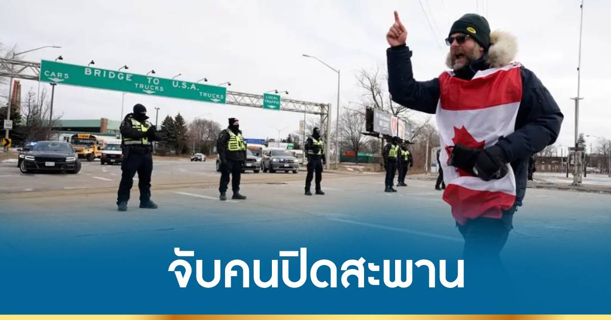 วินด์เซอร์ 13 ก.พ.- ตำรวจแคนาดาจับกุมผู้ประท้วงปิดกั้นสะพานสำคัญที่ข้ามพรมแดนไปยังสหรัฐเป็นรายแรกเมื่อวันเสาร์ หลังจากพยายามหาทางยุติการปิดกั้นด่านที่เป็นเส้นทางการค้าสำคัญระหว่างสองประเทศ