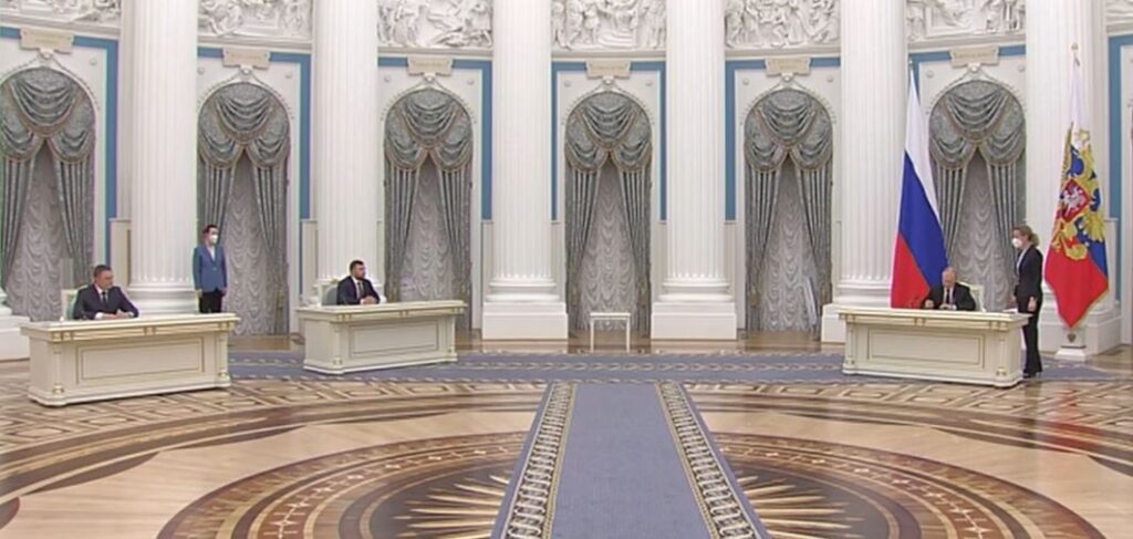 ปูตินพูดเลยว่า ยูเครนสร้างขึ้นมาโดยรัสเซียและไม่เคยมีสถานะเป็นประเทศอย่างแท้จริง แล้วยังกล่าวโจมตีรัฐบาลยูเครนในปัจจุบันว่าเป็นหุ่นเชิดของสหรัฐ จากนั้นเขาจึงลงนามเอกสารรับรองเอกราช 2 ดินแดนทางภาคตะวันออกของยูเครน ซึ่งกลุ่มกบฏฝักใฝ่รัสเซียได้ต่อสู้เพื่อแบ่งแยกดินแดนมาหลายปี ด้วยการประกาศตั้งสาธารณรัฐประชาชนโดเน็ตสก์ และสาธารณรัฐประชาชนลูฮันสก์ เมื่อนายปูตินลงนามเอกสารนี้เท่ากับว่ารับรองให้ทั้งสองดินแดนนี้เป็นเอกราชแยกขาดจากยูเครนแล้ว