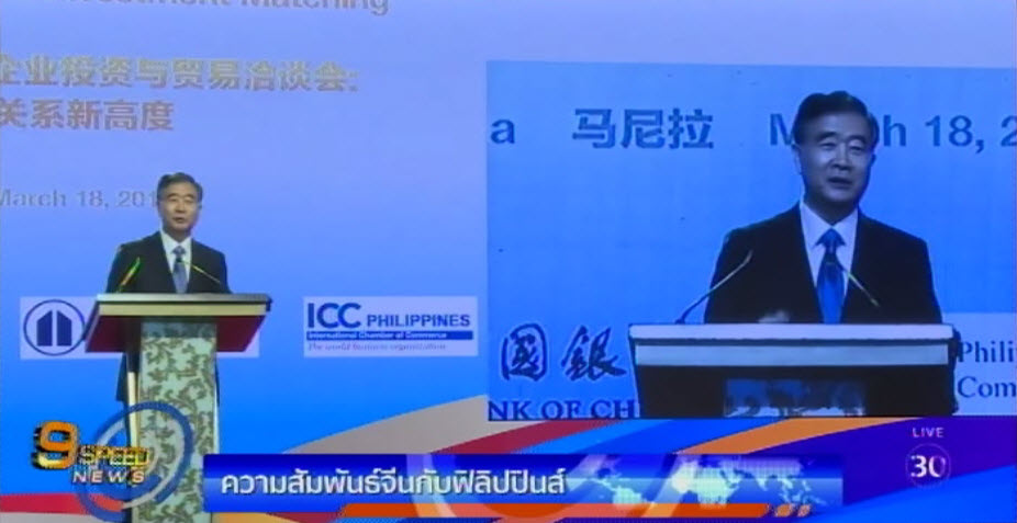 ฟิลิปปินส์ 19 มี.ค. – นายหวัง หยาง รองนายกรัฐมนตรีจีน ชื่นชมความร่วมมือระหว่างจีนกับฟิลิปปินส์ ในการพบปะผู้ประกอบการชาวจีนและฟิลิปปินส์ที่กรุงมะนิลา ในโอกาสที่นายหวังเยือนฟิลิปปินส์เป็นวันที่ 3 ซึ่งก่อนหน้านายหวังได้เข้าพบประธานาธิบดี โรดริโก ดูเตอร์เต เพื่อหารือด้านการค้าและการลงทุน รวมทั้งเรื่องความขัดแย้งในทะเลจีนใต้ ซึ่งเห็นพ้องกันว่าควรมุ่งไปสู่หนทางที่จะทำให้เกิดผลประโยชน์ แก่ทั้งสองประเทศมากที่สุดโดยเฉพาะด้านเศรษฐกิจ สิ่งสำคัญในการมาเยือนครั้งนี้คือการที่จีนจะเข้าไปช่วยพัฒนาสาธารณูปโภค ในฟิลิปปินส์ด้วยการให้กู้ยืมเงินลงทุน และช่วยเหลือด้านเทคนิค ทั้งที่กรุงมะนิลาและเมืองดาเวา ซึ่งเป็นบ้านเกิดของประธานาธิบดีดูเตอร์เตด้วย. -สำนักข่าวไทย