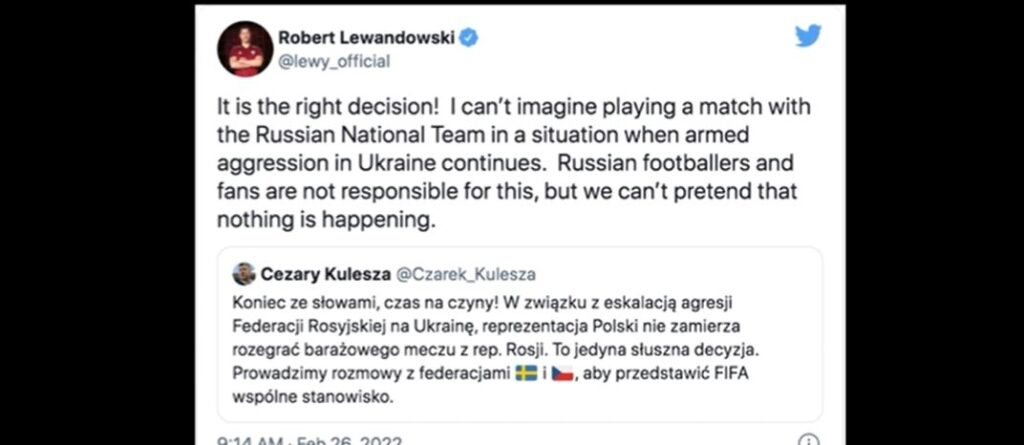 ขณะเดียวกัน โรเบิร์ต เลวานดอฟสกี ดาวยิงของทีมชาติโปแลนด์ก็ได้ประกาศสนับสนุนการตัดสินใจของสมาคมฟุตบอลโปแลนด์ที่ปฏิเสธการลงแข่งขันกับทีมฟุตบอลของรัสเซีย เพื่อคัดเลือกเข้าสู่บอลโลกที่จะมีขึ้นที่กาตาร์ปลายปีนี้ โดยทีมโปแลนด์มีกำหนดพบกับทีมรัสเซียในวันที่ 24 มีนาคมนี้ ขณะที่นายเซซารี คูเลสซา นายกสมาคมฟุตบอลโปแลนด์ระบุในทวิตเตอร์ว่าโปแลนด์ไม่ลงแข่งกับรัสเซียเพื่อเป็นการประท้วงที่รัสเซียบุกยูเครน- สำนักข่าวไทย