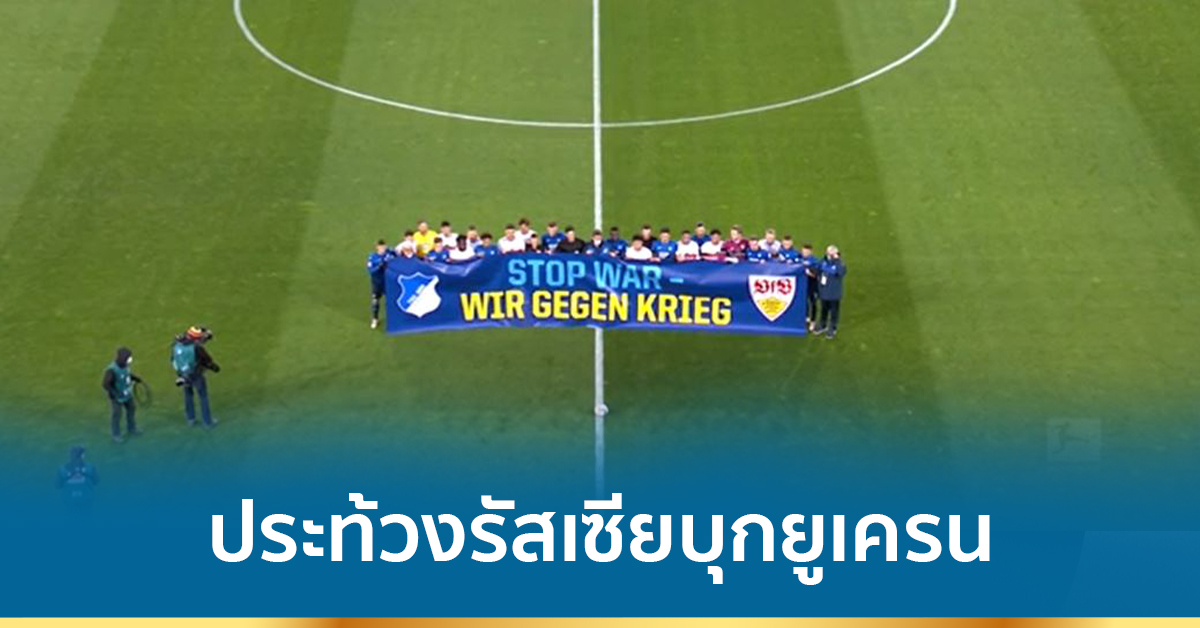นักฟุตบอลของทีมฮอฟเฟนไฮม์และทีมสตุตการ์ท ต่างมารวมตัวกันภายใต้ป้ายแบนเนอร์ต่อต้านสงครามก่อนที่จะลงสนามฟาดแข้งกันในศึกบุนเดสลีกาเมื่อวานนี้ เพื่อเป็นการประท้วงที่รัสเซียบุกยูเครน หลังจากนั้นทีมฮอฟเฟนไฮม์ก็ลงเล่นและสามารถเอาชนะทีมสตุตการ์ตไปได้ด้วยคะแนน 2-1