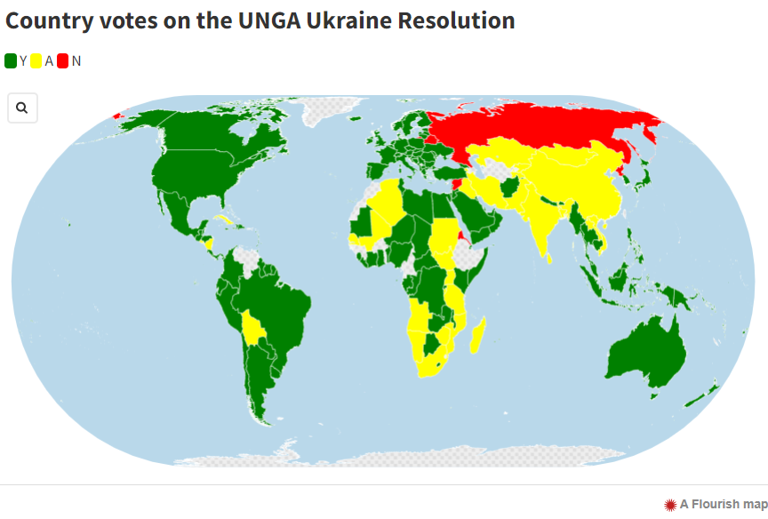 ด้านเว็บไซต์ข่าวยูเอ็นรายงานว่า ญัตติดังกล่าวเรียกร้องให้รัสเซียถอนกำลังทหารทั้งหมดออกจากดินแดนของยูเครนที่อยู่ภายในพรมแดนที่ได้รับการรับรองจากสากลโดยทันที ครบถ้วน และไร้เงื่อนไข สมาชิกกว่า 90 ประเทศเป็นผู้ร่วมเสนอญัตติ และต้องได้เสียงข้างมาก 2 ใน 3 จึงจะผ่านความเห็นชอบ ผลการลงมติเมื่อวันพุธตามเวลานิวยอร์ก มี 141 ประเทศออกเสียงสนับสนุน 5 ประเทศออกเสียงคัดค้าน (เบลารุส เกาหลีเหนือ เอริเทรีย ซีเรียและรัสเซีย) และ 35 ประเทศงดออกเสียง ปิดฉากการประชุมฉุกเฉินพิเศษที่เริ่มมาตั้งแต่วันจันทร์