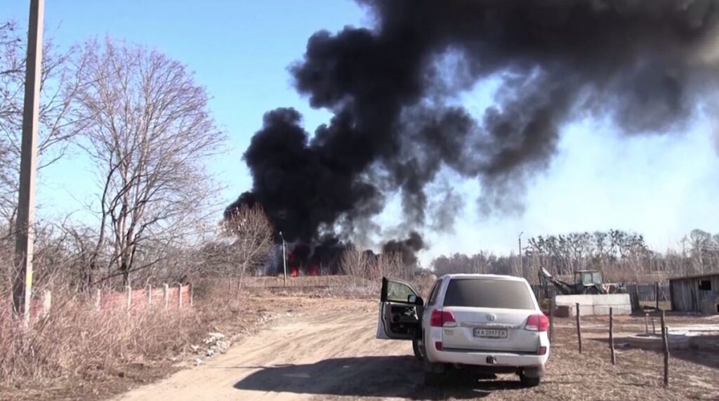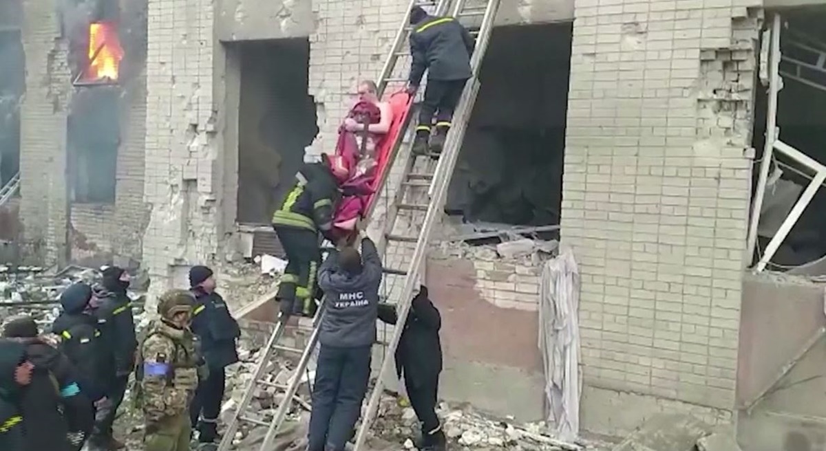 ที่เมืองหลวง พื้นที่กรุงเคียฟ เป็นแนวรบที่หนักหน่วงตั้งแต่เริ่มสงครามมา กองทหารรัสเซียรุกคืบมาอย่างช้าๆ แต่ทำได้เพียงประชิดอยู่ทางเหนือ จนเช้าวันนี้ได้เปิดฉากโจมตีด้วยปืนใหญ่เข้าใส่ชุมชนหลายแห่ง เจ้าหน้าที่กู้ภัยนำร่างผู้หญิงสูงอายุอย่างทุลักทุเลทางบันไดฉุกเฉิน ลงมาจากอาคารที่พักสูง 9 ชั้น ที่เกิดเพลิงลุกไหม้