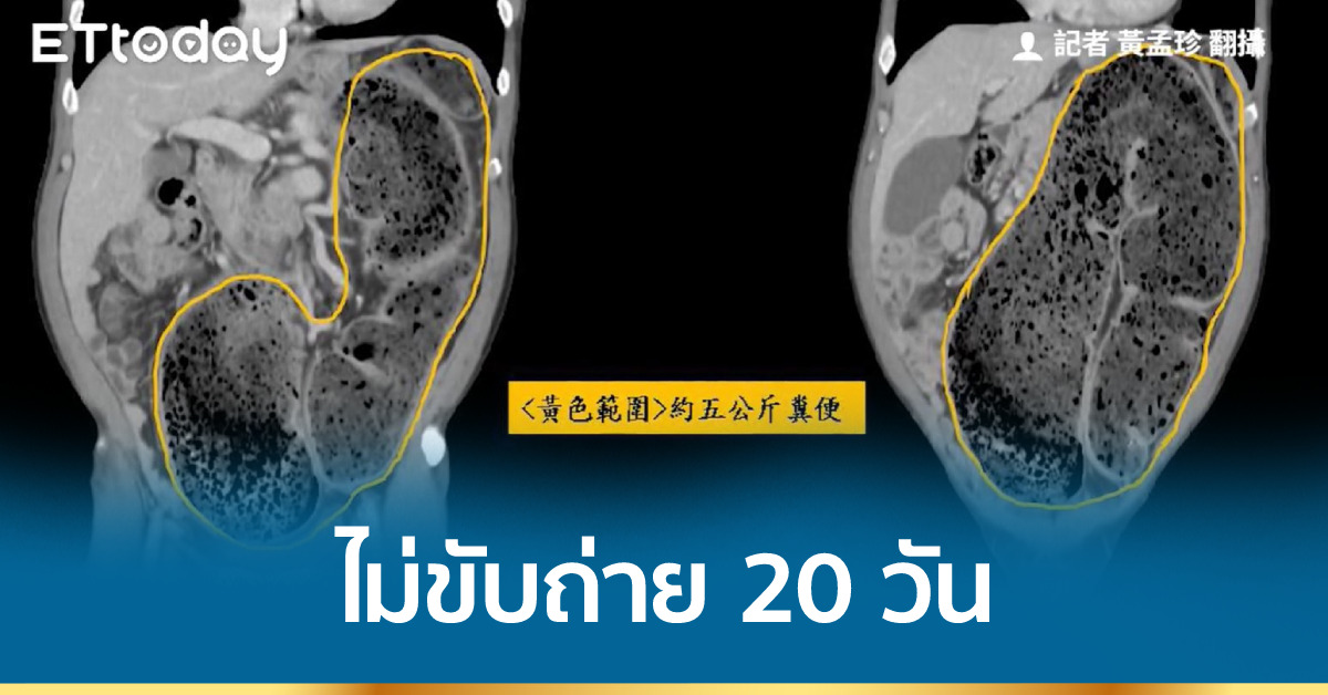 เว็บไซต์ข่าว ctwant.com ของไต้หวัน เผยแพร่เรื่องราวของผู้ป่วยชายอายุ 58 ปี จากนครซินจูทางภาคเหนือของไต้หวัน ที่เข้ามารักษาตัวในโรงพยาบาลหลังไม่ได้ขับถ่ายมาเป็นเวลานาน 20 วัน จนเกิดอาการท้องอืดทนไม่ไหว ต้องรีบเข้าห้องฉุกเฉิน