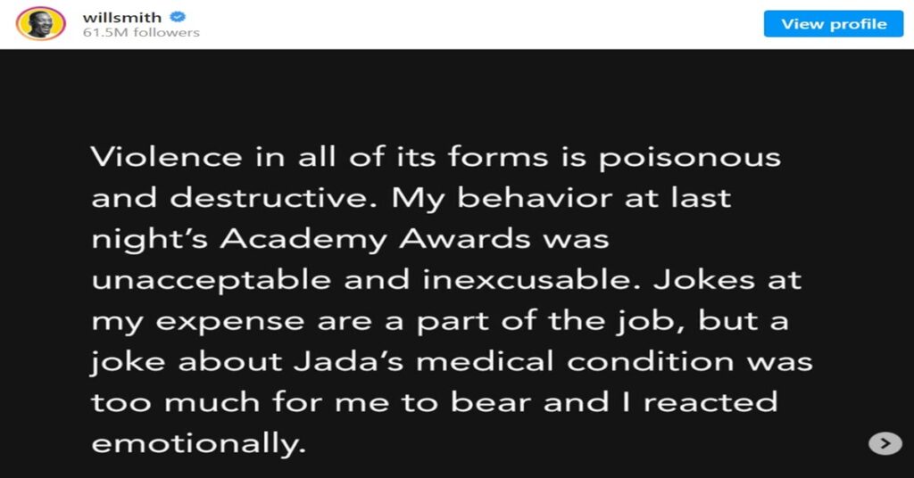 วิล สมิธ ระบุในแถลงการณ์ผ่านอินสตาแกรมว่า การใช้ความรุนแรงทุกรูปแบบมีพิษภัยและเป็นอันตราย พฤติกรรมของเขาในงานประกาศรางวัลออสการ์เมื่อคืนวันอาทิตย์เป็นการกระทำที่ยอมรับไม่ได้และไม่ควรได้รับการอภัย เขาเข้าใจดีว่าการเล่นมุกตลกล้อเลียนเกี่ยวกับตัวเขาเป็นส่วนหนึ่งของการทำงาน แต่การเล่นมุกเกี่ยวกับปัญหาสุขภาพเส้นผมของเจดา พิงคิตต์ สมิธ ภรรยาของเขา ถือเป็นการกระทำที่ก้าวล่วงและเกินขอบเขตที่จะทนไหว จึงทำให้เขาก่อเหตุเช่นนั้นไปด้วยอารมณ์รุนแรง