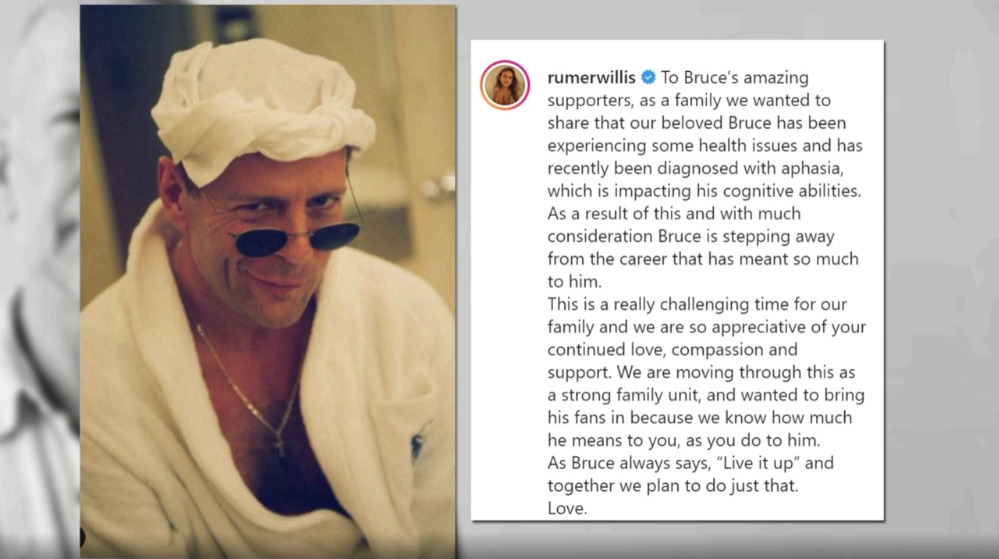 ครอบครัวของ บรูซ วิลลิส นักแสดงรุ่นใหญ่ของฮอลลีวูด วัย 67 ปี ออกแถลงการณ์ผ่านอินสตาแกรม เผยว่าพระเอกชื่อดังกำลังป่วยโรคอะเฟเซีย (Aphasia) หรือภาวะสูญเสียการสื่อความ โดยมีข้อความว่า “ถึงแฟนๆ ที่สนับสนุนและรัก บรูซ วิลลิส ทุกคน พวกเราในฐานะครอบครัวของบรูซ ต้องแจ้งข่าวให้ทุกคนทราบว่า บรูซกำลังเผชิญหน้ากับอยู่กับปัญหาทางด้านสุขภาพ โดยเพิ่งได้รับการวินิจฉัยจากแพทย์ว่ามีความบกพร่องทางสมอง ที่ส่งผลต่อการรับรู้และความสามารถในการสื่อสารของบรูซ ด้วยเหตุนี้และด้วยการพิจารณาอย่างถี่ถ้วน ถึงแก่เวลาที่บรูซจะก้าวออกจากอาชีพนักแสดงที่มีความหมายต่อเขาอย่างมาก นี่เป็นช่วงเวลาที่ท้าทายสำหรับครอบครัวของเราเป็นอย่างมาก เรารู้สึกซาบซึ้งกับความรักและกำลังใจที่ทุกคนส่งมาให้ รวมทั้งแรงสนับสนุนของพวกคุณที่ดีเสมอมา เรากำลังจะก้าวผ่านสิ่งนี้ไปด้วยกันทั้งครอบครัว และเราต้องการให้แฟนๆ ได้รับรู้และเป็นส่วนหนึ่งกับเหตุการณ์นี้ เพราะพวกคุณมีความหมายสำหรับบรูซ และพ่อก็มีความหมายกับพวกคุณเช่นเดียวกัน อย่างที่บรูซเคยพูดเสมอว่า “จงใช้ชีวิตให้คุ้มซะ” และตอนนี้เรากำลังวางแผนจะร่วมกันทำเช่นนั้นให้กับเขาในอนาคต” ข้อความดังกล่าวเป็นแถลงการณ์ร่วมของสมาชิกครอบครัว ได้แก่ เอมมา เฮมมิง วิลลิส ภรรยาคนปัจจุบัน และนักแสดงชื่อดัง เดมี มัวร์ อดีตภรรยา พร้อมด้วยลูกๆ ทั้ง 5 คน ได้แก่ รูเมอร์ สกอต ทอลลูลาห์ เมเบิล และอีฟลีน