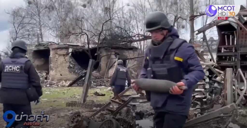 ทั่วเมืองบูจา ถนนหนทางยังเต็มไปด้วยอันตราย เจ้าหน้าที่ทำงานหนักเพื่อกำจัดอาวุธและวัตถุระเบิด ช่วงวันเดียวเก็บกู้ได้ 295 ชิ้น ภาพจากเมืองบูจากลายเป็นสิ่งที่ทิ่มแทงหัวใจผู้คนทั่วโลก
