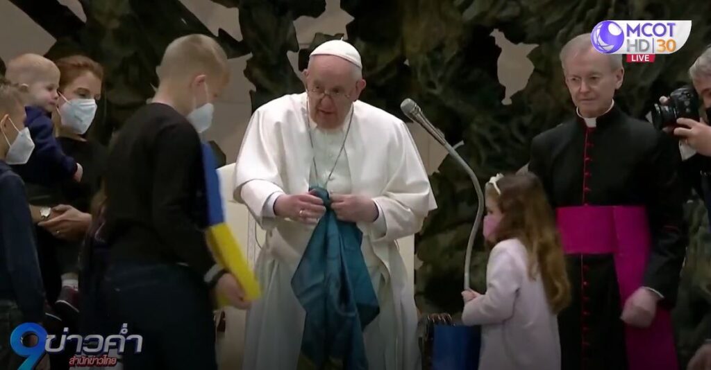 ธงชาติยูเครนผืนนี้มาจากเมืองบูจา สมเด็จพระสันตะปาปาฟรานซิส ประมุขแห่งคริสตจักโรมันคาทอลิก นำมาร่วมสวดมนต์กับเด็กๆ ชาวยูเครนที่หนีภัยสงคราม ที่สำนักวาติกัน