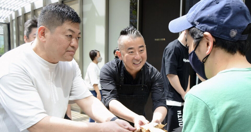 โตเกียว 11 เม.ย.- เจ้าของร้านอาหารระดับมิชลิน 2 ดาวในกรุงโตเกียวของญี่ปุ่น (คนสวมเสื้อขาว) แจกข้าวปั้นให้แก่ผู้บริจาคเงินเข้ามูลนิธิช่วยเหลือเด็กที่ได้รับผลกระทบจากสงครามในยูเครน โดยมีชาวยูเครนที่เพิ่งลี้ภัยในญี่ปุ่นมาช่วยทำข้าวปั้นด้วย