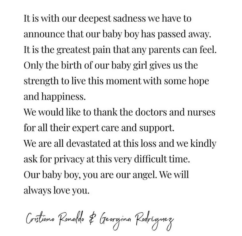 โรนัลโด วัย 37 ปี และโรดริเกซ วัย 28 ปี ระบุในแถลงการณ์ร่วมผ่านสื่อโซเชียลมีเดียว่า ทั้งสองคนเสียใจอย่างยิ่งที่ต้องแจ้งให้ทุกคนทราบว่าลูกแฝดชายเสียชีวิตขณะคลอด และรู้สึกเจ็บปวดใจต่อการสูญเสียในครั้งนี้ แต่ก็ต้องเข้มแข็งต่อไปเพื่อลูกแฝดสาวอีกคนที่ได้ถือกำเนิดขึ้น นอกจากนี้ โรนัลโดและโรดริเกซยังขอให้ทุกคนเคารพความเป็นส่วนตัวของพวกเขาในช่วงเวลาที่แสนยากลำบากนี้ รวมถึงกล่าวขอบคุณคณะแพทย์และพยาบาลที่ให้การดูแลและช่วยเหลือในระหว่างคลอด