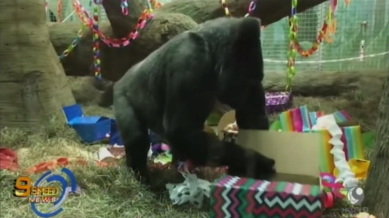 “โคโล” ลิงกอริลลาเพศเมีย ในสวนสัตว์และพิพิธภัณฑ์สัตว์น้ำโคลัมบัส รัฐโอไฮโอ ของสหรัฐ ฉลองวันเกิดปีที่ 60 ด้วยการแกะของขวัญอย่างเพลิดเพลิน ท่ามกลางผู้คนจำนวนมากที่มาเยือนสวนสัตว์