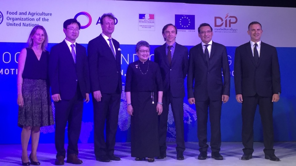 องค์การอาหารและเกษตรแห่งสหประชาชาติ (FAO) ร่วมกับคณะผู้แทนสหภาพยุโรปประจำประเทศไทย สถานเอกอัครราชทูตฝรั่งเศสประจำประเทศไทย และกรมทรัพย์สินทางปัญญา แถลงข่าวในโอกาสขึ้นทะเบียนสินค้าเกษตรและหัตถกรรม 3 ประเภทจากไทยและกัมพูชา เป็นสินค้าสิ่งบ่งชี้ทางภูมิศาสตร์ (GI) ในต่างประเทศ ได้แก่ ผ้าไหมยกดอกลำพูนของไทย จดทะเบียนในอินโดนีเซีย พริกไทยจังหวัดกัมปอต และน้ำตาลปึกจังหวัดกัมปงสะปือของกัมพูชา จดทะเบียนในไทย ถือเป็นการนำร่องจดทะเบียนสินค้าที่เป็นเอกลักษณ์ของท้องถิ่นระหว่างประเทศในกลุ่มสมาชิกอาเซียนด้วยกัน