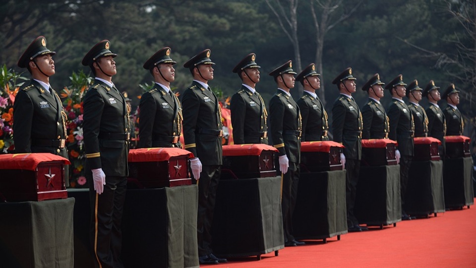 กองทหารเกียรติยศจีนรับกล่องไม้เคลือบเงาบรรจุศพทหารแต่ละนายจากทหารเกาหลีใต้ที่ท่าอากาศยานอินชอนของเกาหลีใต้ในวันนี้ นายซุน เฉ่าเฉิง รัฐมนตรีช่วยกิจการพลเรือนของจีนกล่าวในพิธีรับมอบว่า รู้สึกซาบซึ้งใจในมิตรภาพและไมตรีจิตที่ประชาชนและสื่อเกาหลีใต้ได้แสดงออกต่อการส่งคืนศพทหารจีน จนถึงขณะนี้จีนได้รับศพทหารกลับมาตุภูมิแล้ว 569 ศพนับตั้งแต่สองประเทศทำข้อตกลงนี้เมื่อ 3 ปีก่อน คาดว่ามีทหารจีนพลีชีพไม่ต่ำกว่า 180,000 นาย จากที่จีนส่งไปหลายล้านนายช่วยเกาหลีเหนือทำสงครามกับเกาหลีใต้และสหรัฐในปี 2493-2496