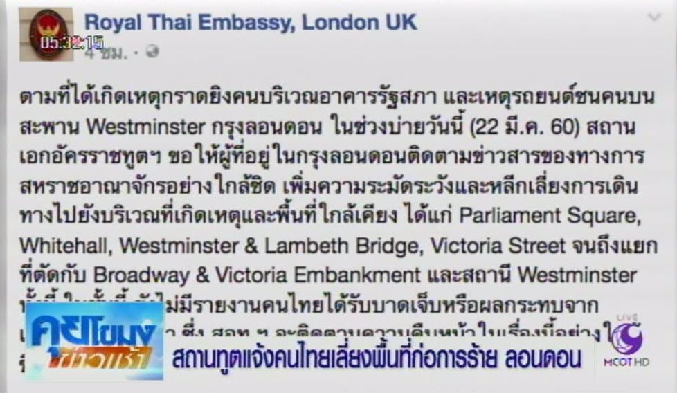 เมื่อค่ำวานนี้ (22 มี.ค.) สถานเอกอัครราชทูตไทย ณ กรุงลอนดอน แจ้งผ่านเฟซบุ๊กว่า ตามที่เกิดเหตุกราดยิงคนบริเวณอาคารรัฐสภา และเหตุรถยนต์ชนคนบนสะพานเวสต์มินสเตอร์ ในกรุงลอนดอน ของอังกฤษ ในช่วงบ่ายวานนี้ (22 มี.ค.) ตามเวลาท้องถิ่น ขณะนี้ยังไม่มีรายงานว่ามีคนไทยได้รับบาดเจ็บ หรือได้รับผลกระทบจากเหตุการณ์ดังกล่าว