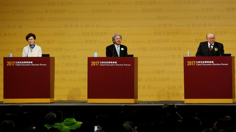 ตัวเก็งผู้บริหารฮ่องกงคนใหม่คือนางแคร์รี่ ลัม วัย 59 ปี อดีตหัวหน้าเลขาธิการฝ่ายบริหารฮ่องกง ซึ่งเป็นข้าราชการตำแหน่งสูงสุด เธอประกาศตัวลงเลือกตั้งหลังลาออกจากตำแหน่งเมื่อเดือนมกราคม ฝ่ายเรียกร้องประชาธิปไตยมองว่าเธอคือตัวแทนของนายเหลียง ชุนอิง ที่กำลังจะหมดวาระหลังดำรงตำแหน่งมาตั้งแต่เดือนกรกฎาคม 2555 คู่แข่งคนสำคัญของนางลัมคือนายจอห์น เจิง วัย 65 ปี เจ้าของฉายามิสเตอร์พริงเกิลส์ เพราะมีหนวดเหมือนโลโกมันฝรั่งยี่ห้อนั้น กรรมการฝ่ายเรียกร้องประชาธิปไตยจะลงคะแนนให้เขาหวังสกัดนางลัมและไม่ส่งผู้สมัครของตนเองเพราะเกรงเสียงแตก ส่วนนายหวู กว็อกฮิง ผู้พิพากษาวัย 71 ปี ที่มีแนวคิดเสรีนิยมที่สุดน่าจะมีคะแนนน้อยที่สุด
