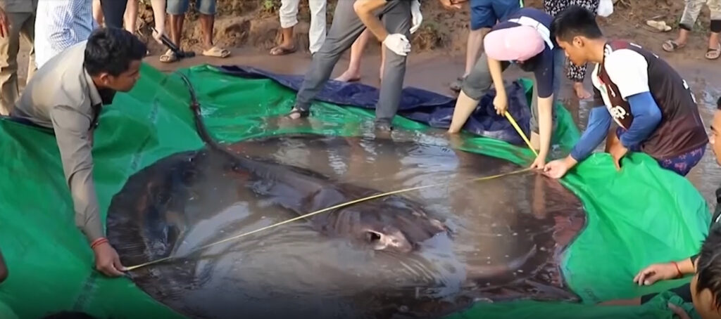 ชาวประมงท้องถิ่นในกัมพูชา จับปลากระเบนตัวนี้ได้เมื่อสัปดาห์ที่แล้ว บริเวณทางใต้ของเมืองสตึงเตรง และได้แจ้งกับทีมนักวิทยาศาสตร์ในโครงการ วันเดอส์ ออฟ เดอะแม่โขง จากองค์การเพื่อการพัฒนาระหว่างประเทศของสหรัฐ หรือ ยูเสด ซึ่งกำลังทำงานวิจัยเกี่ยวกับปลาชนิดนี้อยู่ นักวิจัยคนหนึ่งบอกว่า การได้พบปลากระเบนยักษ์ ไม่เพียงแต่เป็นการทำสถิติใหม่ แต่ยังเป็นสัญญาณที่ดีที่ชี้ให้เห็นว่าสภาพธรรมชาติบริเวณแม่น้ำโขงในปัจจุบันยังคงความสมบูรณ์ แม้ว่าจะต้องเผชิญกับความท้าทายจากภายนอก ทีมงานได้ติดอุปกรณ์ไว้ที่ปลากระเบนตัวนี้เพื่อติดตามเก็บข้อมูลต่อไป สำหรับปลากระเบนยักษ์ที่พบ เป็นตัวที่สี่ที่พบในบริเวณเดียวกันในช่วง 2 เดือนที่ผ่านมา ทุกตัวเป็นเพศเมีย