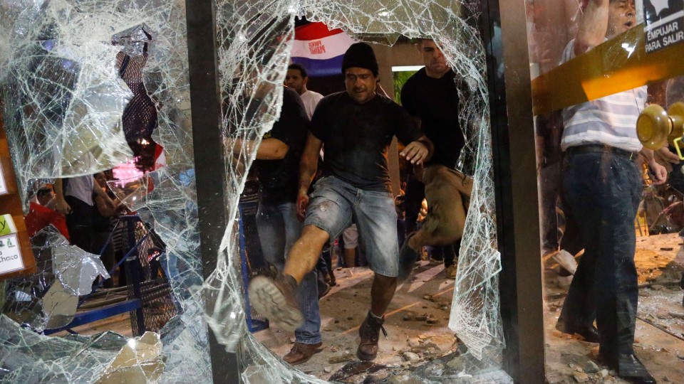 ปารากวัย 1 เม.ย. – กลุ่มผู้ประท้วงบุกและจุดไฟเผาอาคารรัฐสภาปารากวัยเมื่อวันศุกร์ ภายหลังจากวุฒิสภาลักลอบลงมติแก้ไขรัฐธรรมนูญเพื่อให้ประธานาธิบดีโฮราซิโอ การ์เตสได้ลงเลือกตั้งอีกสมัย ซึ่งเป็นความเคลื่อนไหวที่จำเป็นต้องได้รับการอนุมัติจากสภา