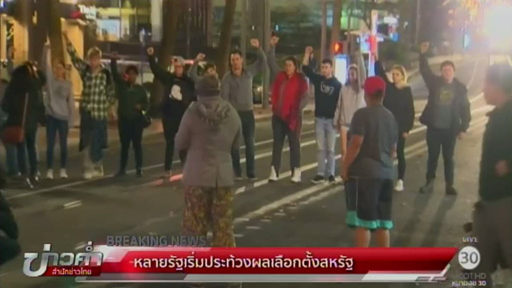 สหรัฐ 9 พ.ย.-มีรายงานข่าวล่าสุดหลังจากทราบผลอย่างไม่เป็นทางการว่า นายโดนัลด์ ทรัมป์ ผู้สมัครจากพรรคริพับลิกัน สามารถคว่ำนางฮิลลารี คลินตัน ก้าวขึ้นเป็นว่าที่ประธานาธิบดีสหรัฐอเมริกา คนที่ 45 ขณะนี้หลายรัฐประชาชนก่อเหตุประท้วงผลการเลือกตั้งครั้งนี้แล้ว