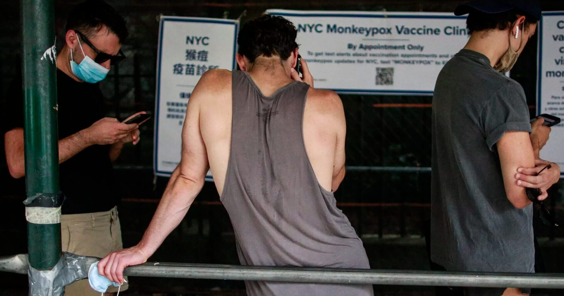 ภาพคนรอฉีดวัคซีนโรคฝีดาษลิงที่โรงเรียนมัธยมในย่านบุชวิคของบรุกลิน ซึ่งเป็นเขตที่มีประชากรหนาแน่นที่สุดในนครนิวยอร์ก สะท้อนภาพการฉีดวัคซีนป้องกันโรคติดเชื้อไวรัสโคโรนา 2019 หรือโควิด-19 เมื่อครั้งที่นครนิวยอร์กเคยเป็นศูนย์กลางการระบาดเช่นเดียวกัน หลายคนเผยว่า โชคดีที่สามารถจองฉีดวัคซีนฝีดาษลิงได้ทัน เพราะหลังจากที่เว็บไซต์ของทางการนครนิวยอร์กเปิดให้ลงทะเบียนเมื่อเวลา 18:00 น.วันศุกร์ตามเวลาท้องถิ่น ยอดจองวัคซีนที่มีอยู่ทั้งหมด 9,200 โดสก็เต็มภายในเวลาเพียง 7 นาทีเท่านั้น ส่วนช่วง 3 วันก่อนหน้านั้นมีคนเข้าไปจองล้นหลามจนเว็บไซต์ล่ม
