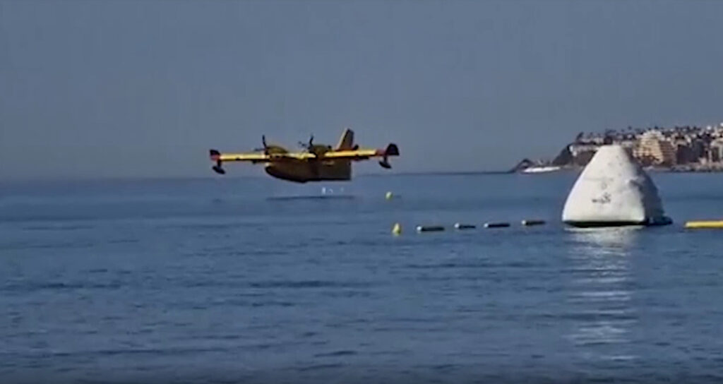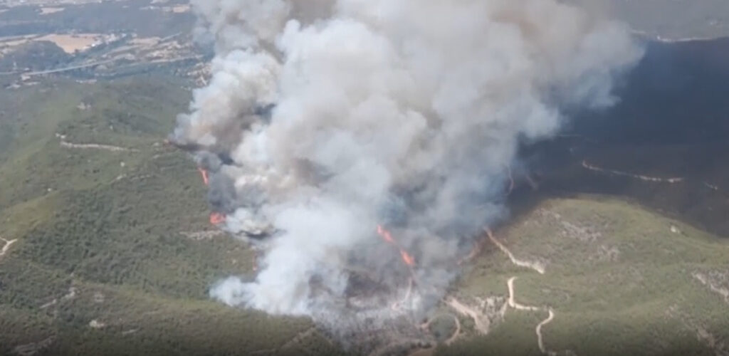 ไฟป่าที่แคว้นกาตาลุนญา มีกลุ่มควันหนาทึบปกคลุมพื้นที่เป็นบริเวณกว้าง เครื่องบินดับไฟป่าของสเปนร่อนลงในทะเลเพื่อนำน้ำไปดับไฟป่า ท่ามกลางสายตานักท่องเที่ยวจำนวนมากที่กำลังพักผ่อนอยู่บนชายหาด