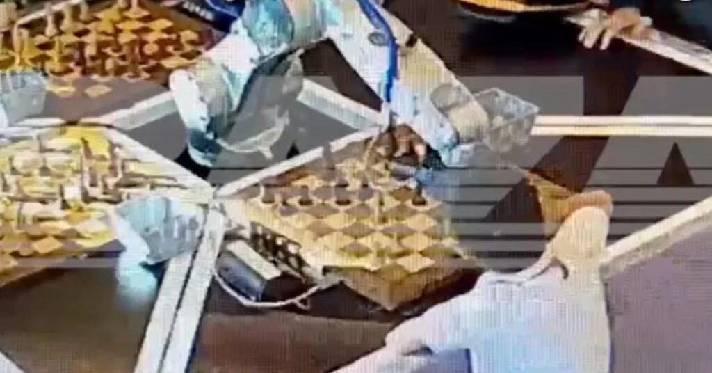 คลิปวิดีโอจากกล้องวงจรปิดที่เผยแพร่ในสื่อออนไลน์แสดงให้เห็นภาพหุ่นยนต์หมากรุก ซึ่งมีลักษณะเป็นแขนกลอัตโนมัติขนาดใหญ่และขับเคลื่อนโดยปัญญาประดิษฐ์ หรือเอไอ ได้คว้าและตรึงนิ้วของเด็กชายไว้แน่นเป็นเวลาหลายวินาที ก่อนเจ้าหน้าที่หลายคนได้กรูเข้ามาช่วยแงะนิ้วเด็กชายออกมาได้. -สำนักข่าวไทย